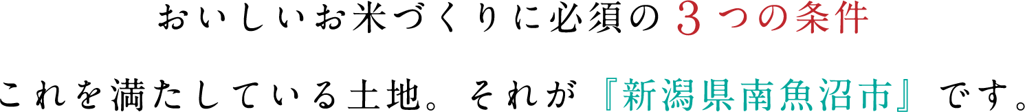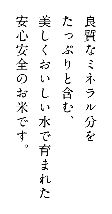 お米の栽培には一年を通して大量の水が必要で、さらにその水が美味しいことが何よりも重要です。周囲を越後山脈、三国山脈、魚沼丘陵といった越後三山に囲まれた南魚沼市は日本でも有数の豪雪地帯。この山々から生み出された豊富な雪解け水が魚沼盆地に流れ込むため、田んぼに十分な水を確保できるのです。さらにその水には、肥沃な土壌から染み出した良質なミネラル分がたっぷりと含まれているため、透明で美しくおいしい水となっています。